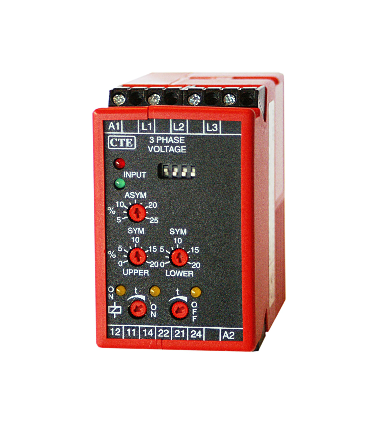 Three-phase voltage monitoring relay for detecting phase loss and imbalance. Operates at 380V, 400V, and 415V AC with adjustable settings. Provides motor and transformer protection with programmable time delays and LED status indicators. Suitable for pumps, oil burners, ventilators, and refrigeration systems.
